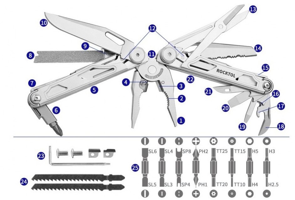 La multiherramienta ROCKTOL SK05VG 29 en 1 es una solución completa, robusta y versátil diseñada para afrontar cualquier tarea, desde trabajos profesionales hasta aventuras outdoor. Fabricada en acero inoxidable de alta resistencia, integra múltiples funciones en un diseño compacto, ergonómico y seguro.