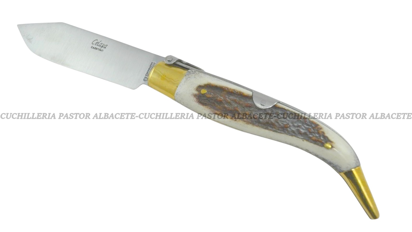 La Navaja Celaya Pastora Ciervo Latón es una pieza emblemática de la cuchillería tradicional española, fabricada artesanalmente en Albacete,