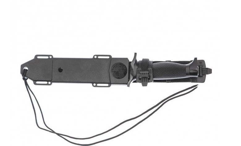 El cuchillo Aitor Oso Black incorpora funda de poliamida negra resistente, con logotipo de la marca, adaptable a equipos militares y diseñada para transporte seguro y cómodo.