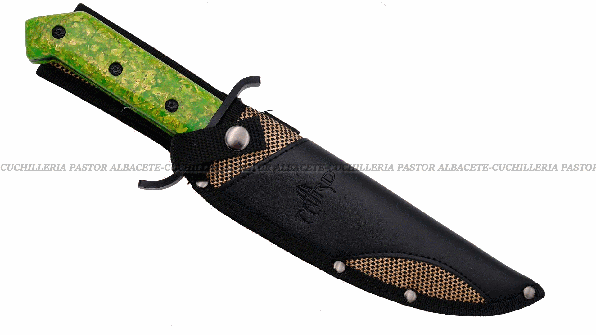 Uno de los aspectos más destacados de este modelo es su mango de resina fluorescente, que brilla en la oscuridad. Esta característica resulta especialmente útil en situaciones de baja visibilidad, permitiendo localizar el cuchillo fácilmente durante la noche o en entornos con poca luz.