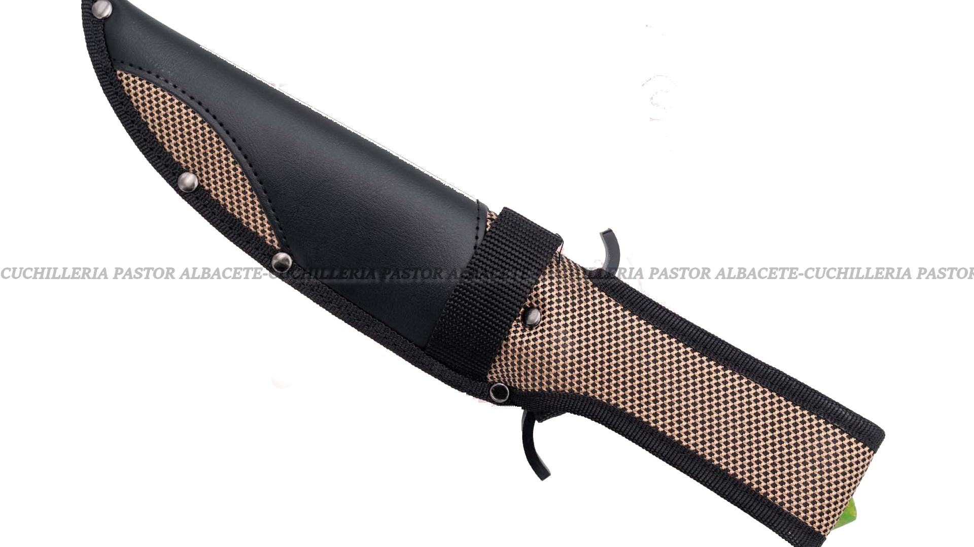 El cuchillo incluye una funda de nylon de alta densidad con detalles en piel, diseñada para ofrecer protección, durabilidad y facilidad de transporte. Ideal para llevarlo de forma segura durante tus actividades al aire libre.