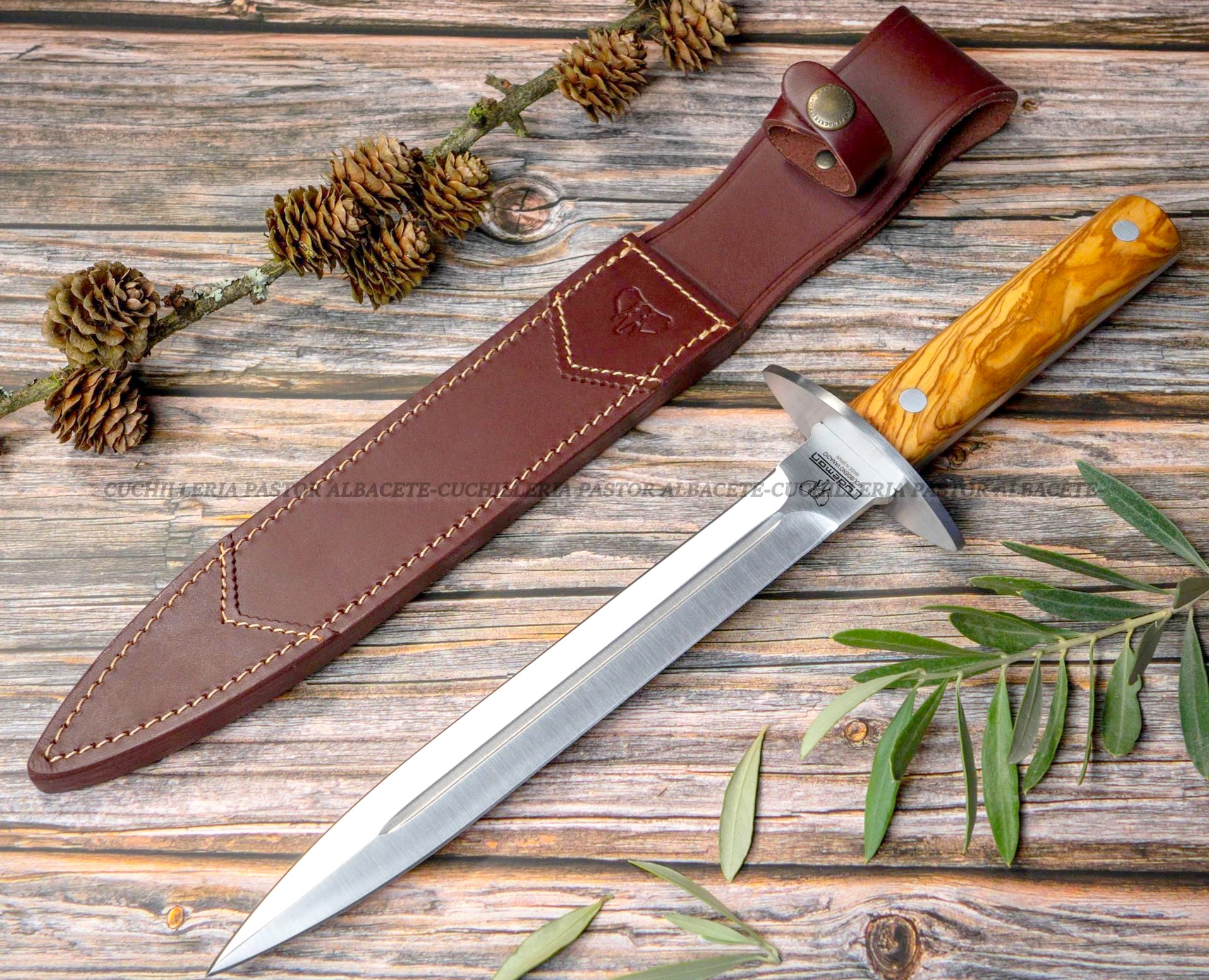 El mango está hecho de Madera de Olivo, remachado con aluminio tipo “gotacera” y protegido por una cruceta de acero inoxidable 420 pulida para evitar deslizamientos