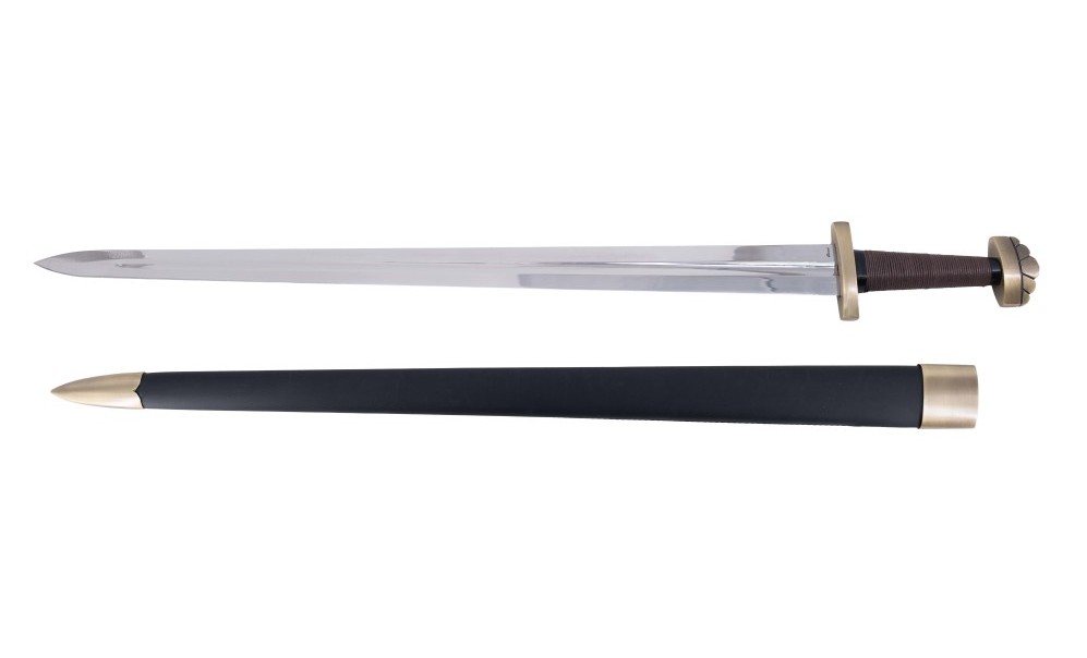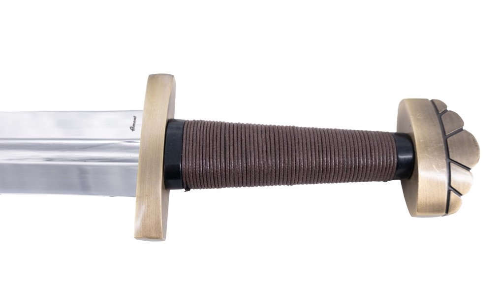 Uno de los rasgos más llamativos de la espada es su pomo y guarda con acabado dorado, un detalle que evoca las armas de alto rango o ceremoniales de la época vikinga.