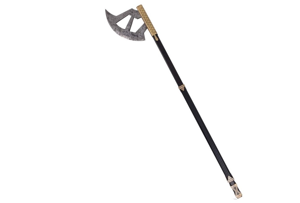 Con un tamaño total de 118 cm, esta hacha reproduce el estilo característico del guerrero enano, miembro valiente de la Comunidad del Anillo.