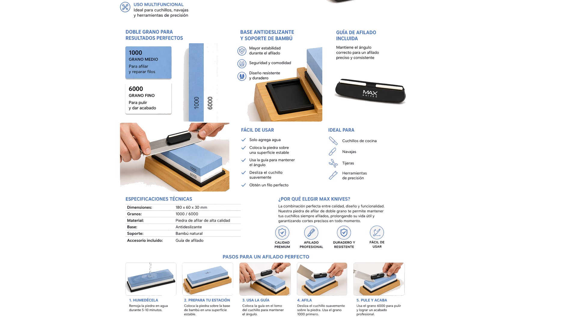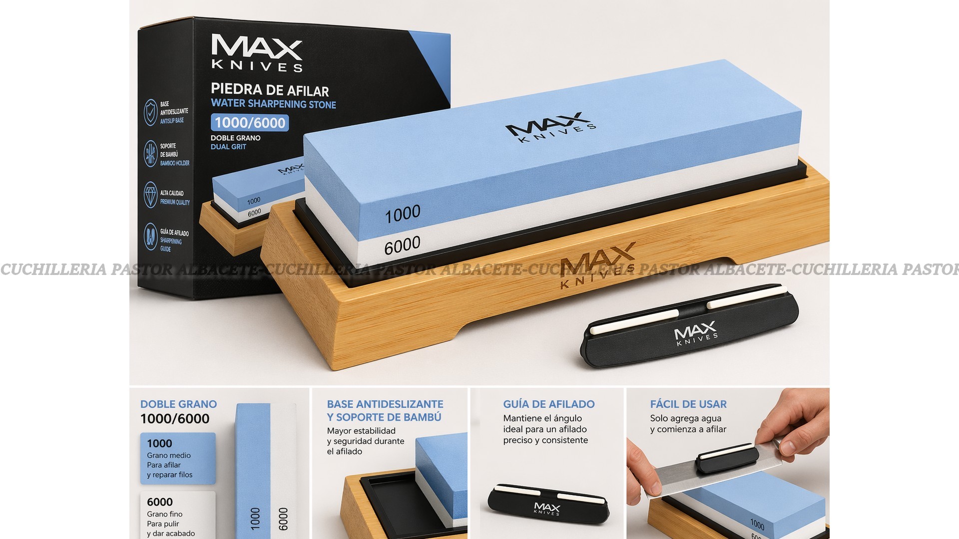 MAX KNIVES Piedra de Afilar 1000/6000 con Base Afilado Preciso