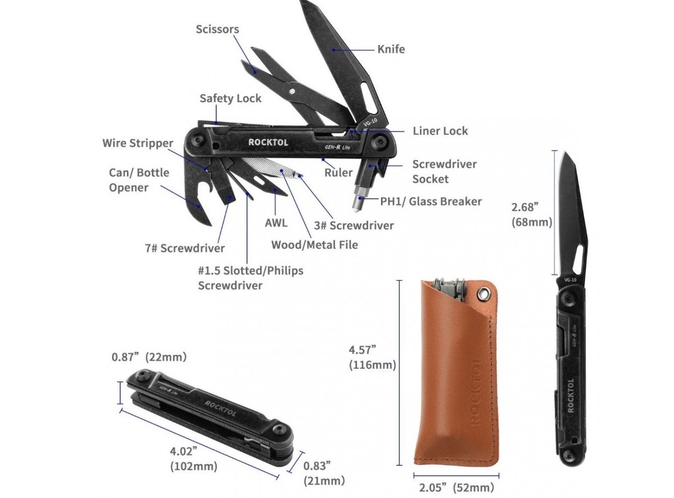 La ROCKTOL GEN-R Lite 15 en 1 es una multiherramienta compacta, elegante y funcional, diseñada para el uso diario (EDC). Con un acabado negro lavado a la piedra y materiales resistentes, combina estilo, durabilidad y practicidad en un formato ligero y fácil de transportar.