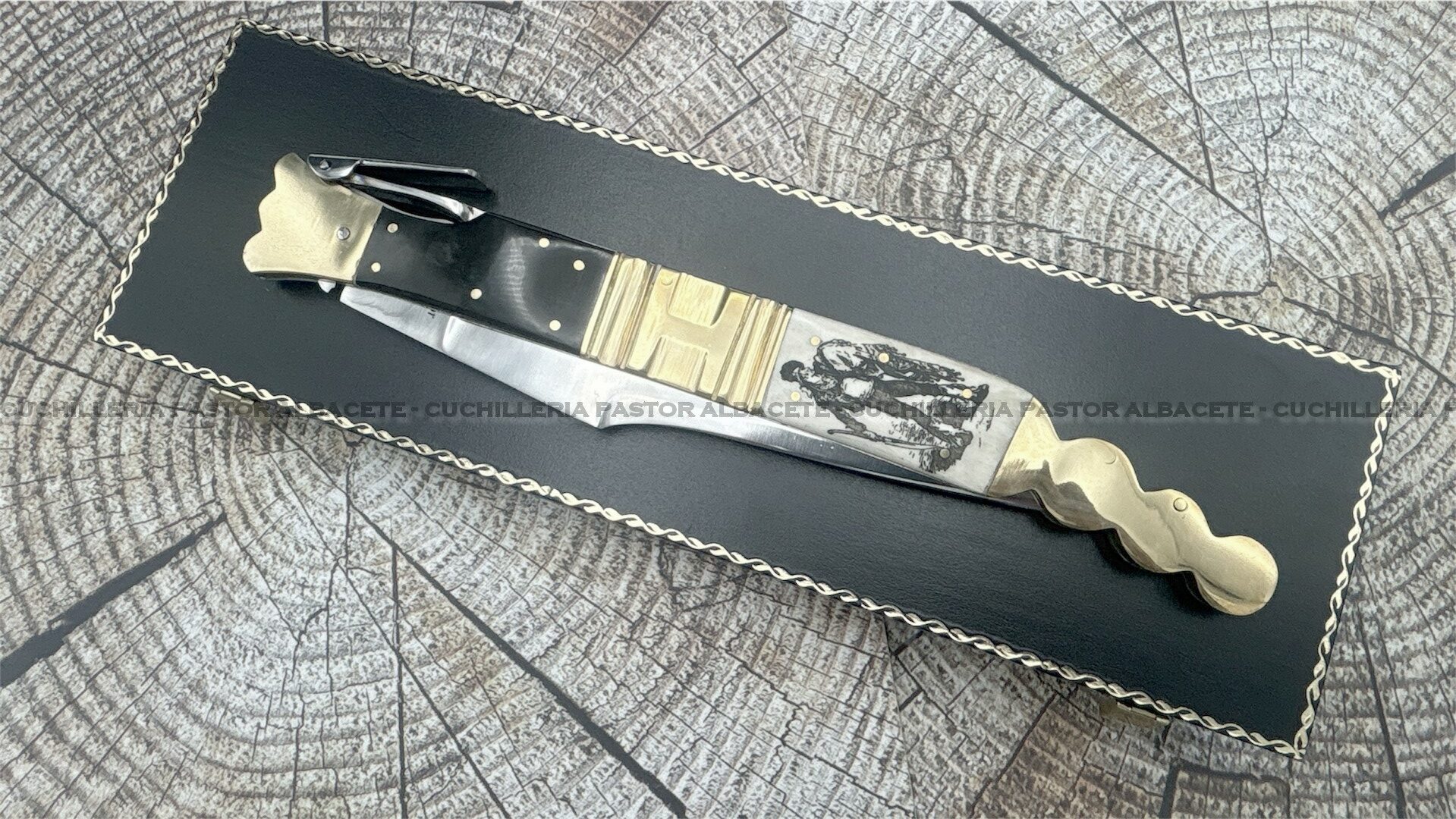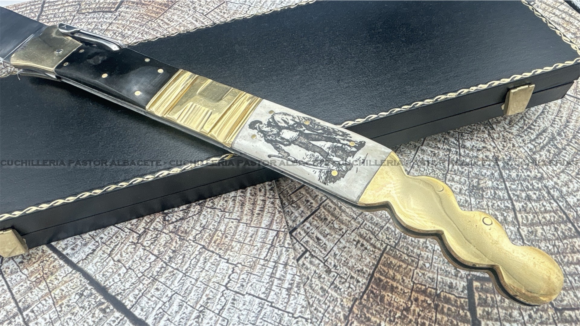 Su empuñadura combina materiales nobles como asta de toro y hueso grabado, decorada con una figura de bandolero en ambas caras, junto con virolas de latón y forros de acero que refuerzan su estructura.