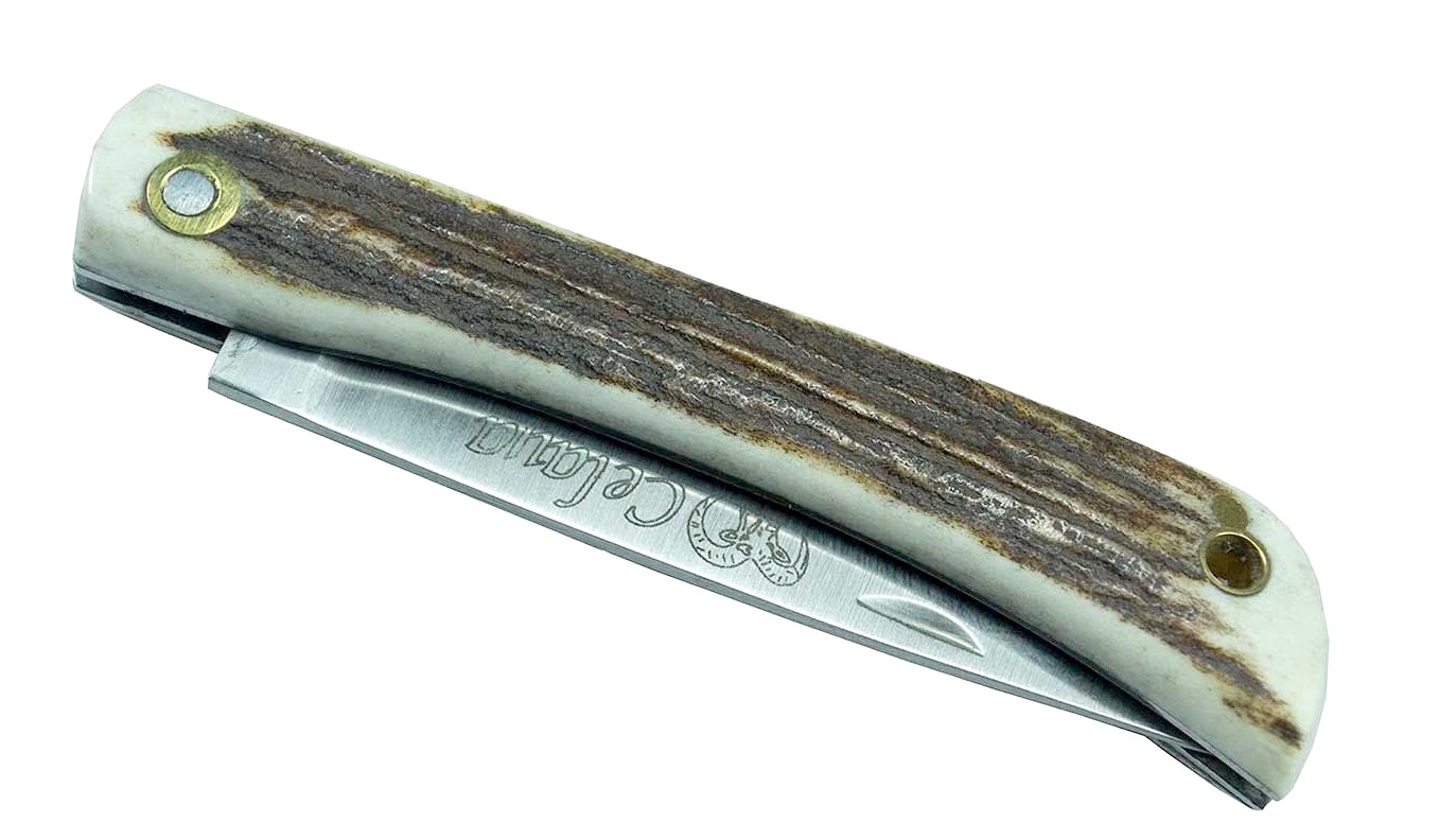 El mango está elaborado en asta de Ciervo, un material natural muy apreciado por su belleza, resistencia y exclusividad.