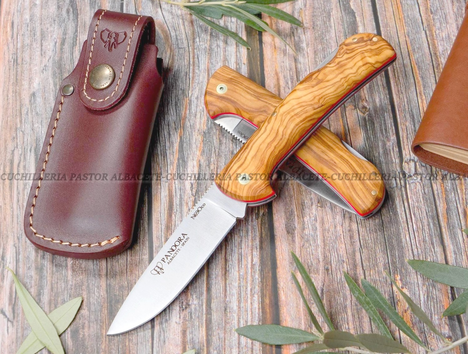 Diseño elegante con cachas de madera de olivo y separadores rojos.