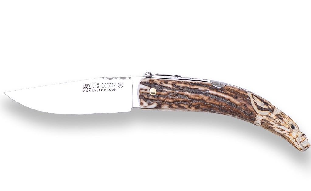 La navaja Joker NC142 de ciervo tallado es una pieza clásica de alta calidad, elaborada de forma artesanal en Albacete, cuna de la cuchillería española.