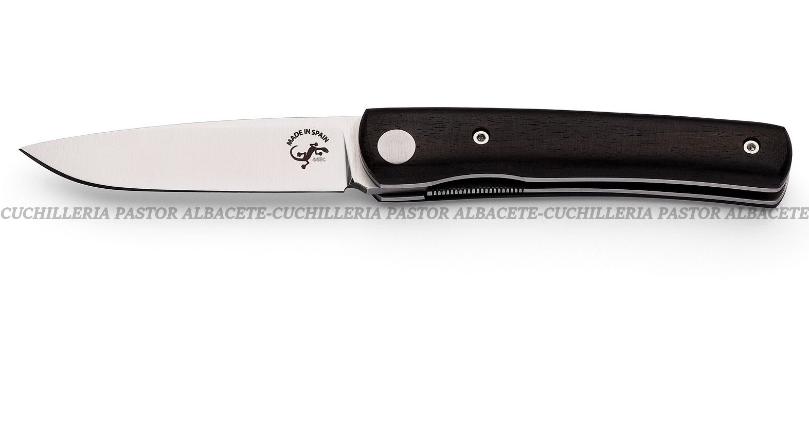 El mango combina forros de acero inoxidable con cachas de madera de ebano. es una madera tropical extremadamente densa y dura.