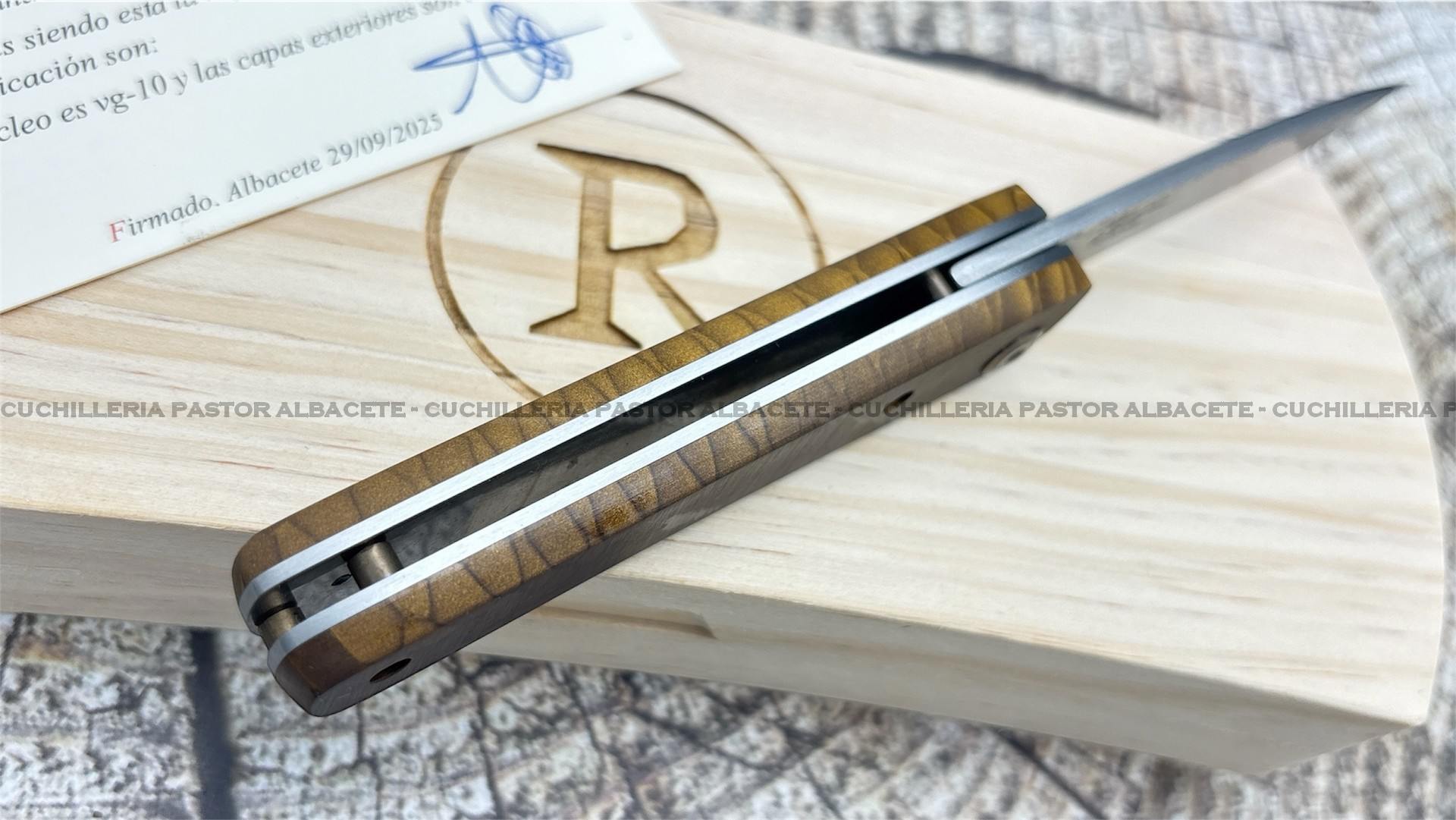 Su empuñadura combina forros de acero inoxidable con cachas elaboradas en Juma marrón, un material sintético de alta densidad y gran resistencia. La Juma se distingue por su textura suave, aspecto nacarado y excelente durabilidad, aportando un toque moderno y elegante.