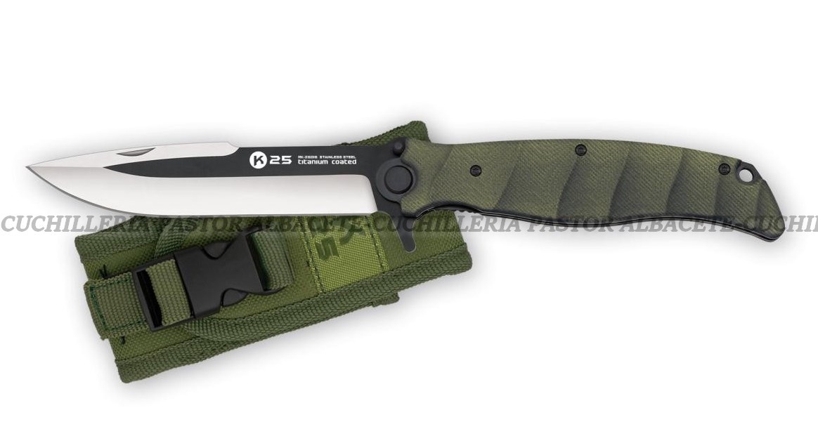La navaja táctica K25 G10 Verde destaca por su diseño moderno y funcional, ideal para actividades al aire libre como senderismo, camping o supervivencia.
