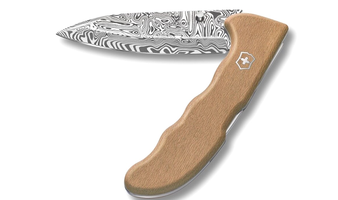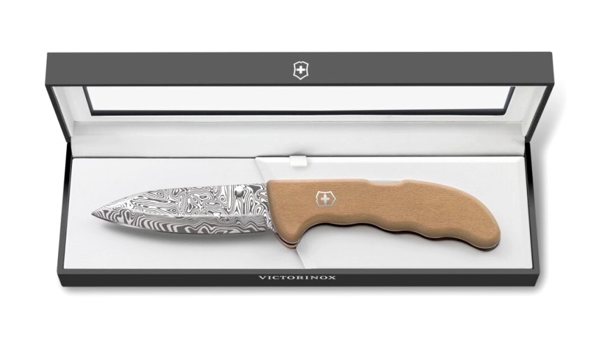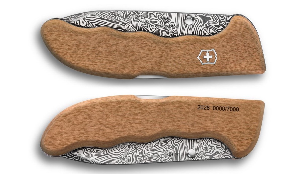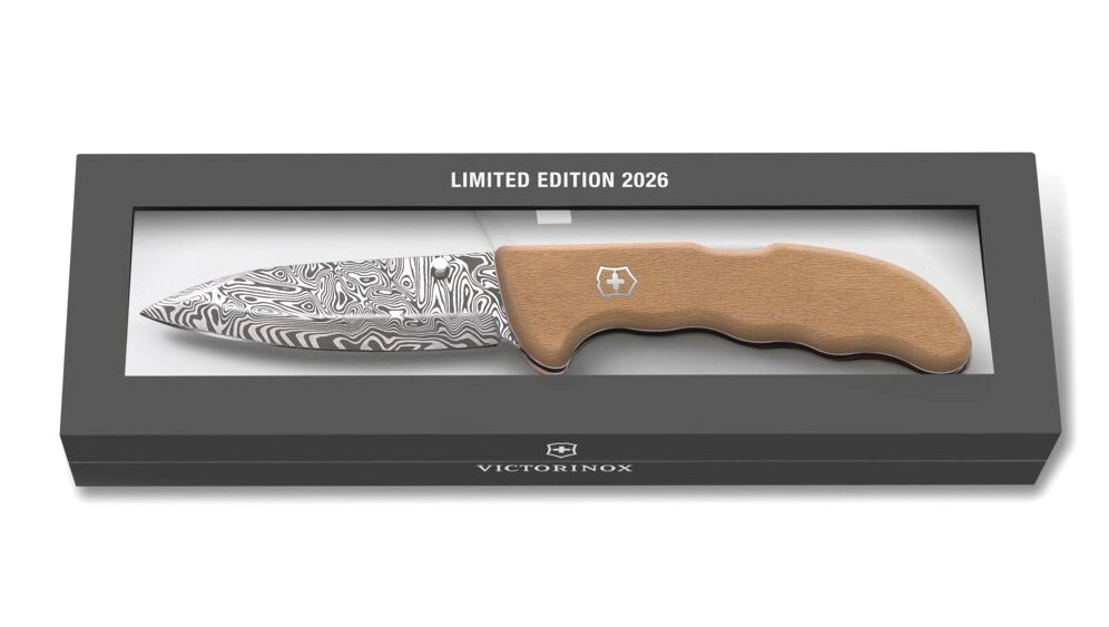 La Evoke Wood Damast 2026 es el cuchillo anual de Victorinox y cuenta con: